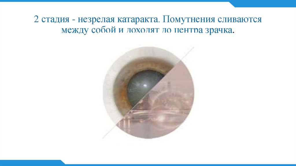 2 стадия - незрелая катаракта. Помутнения сливаютсямежду собой и доходят до центра зрачка.