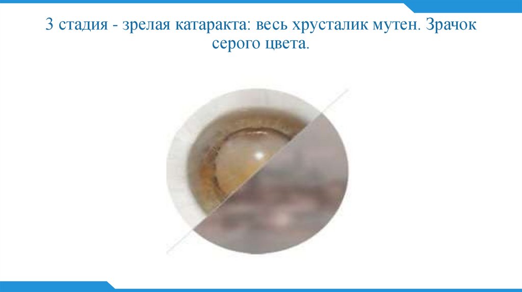3 стадия - зрелая катаракта: весь хрусталик мутен. Зрачоксерого цвета.