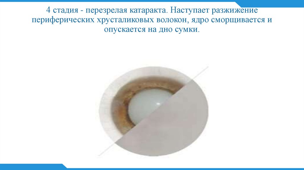 4 стадия - перезрелая катаракта. Наступает разжижениепериферических хрусталиковых волокон, ядро сморщивается и