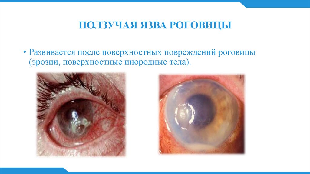 ПОЛЗУЧАЯ ЯЗВА РОГОВИЦЫ• Развивается после поверхностных повреждений роговицы
