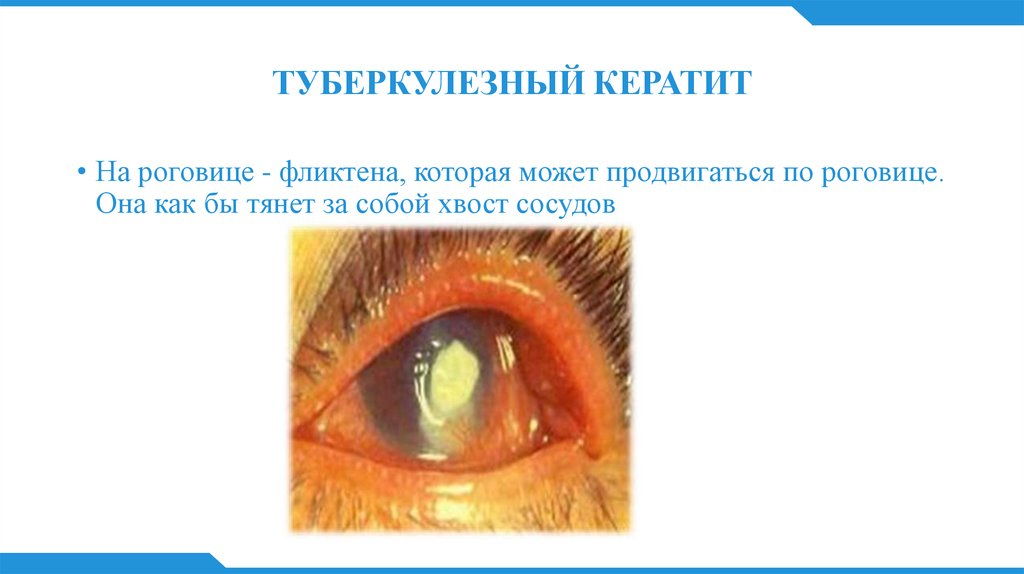 ТУБЕРКУЛЕЗНЫЙ КЕРАТИТ• На роговице - фликтена, которая может продвигаться по роговице.