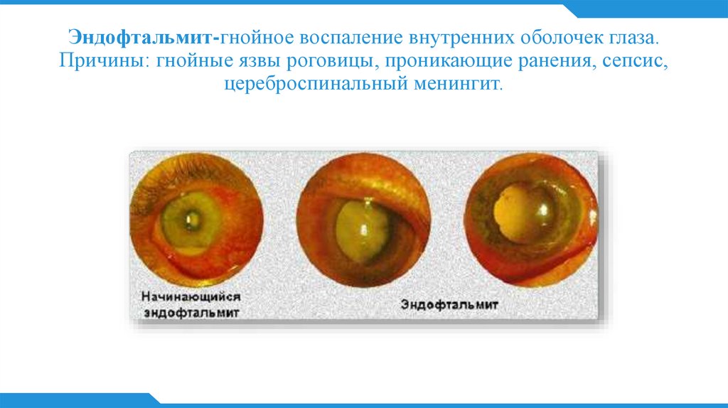Эндофтальмит-гнойное воспаление внутренних оболочек глаза.Причины: гнойные язвы роговицы, проникающие ранения, сепсис,