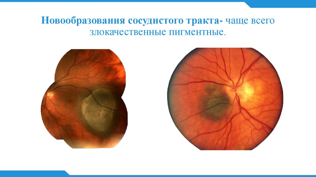 Новообразования сосудистого тракта- чаще всегозлокачественные пигментные.
