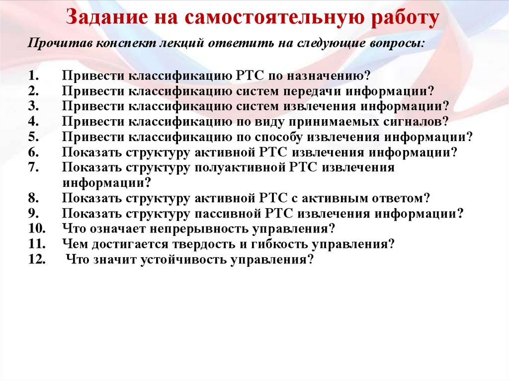 Задание на самостоятельную работуПрочитав конспект лекций ответить на следующие вопросы:
