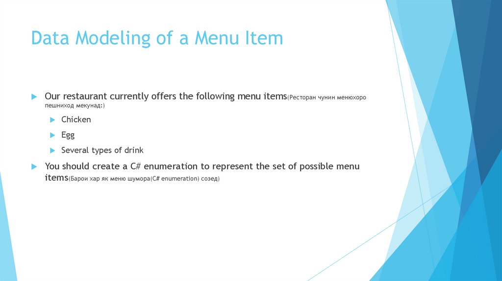 Data Modeling of a Menu ItemOur restaurant currently offers the following menu items(Ресторан чунин менюхоро