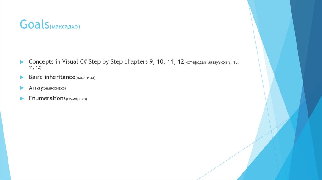 Goals(максадхо)Concepts in Visual C# Step by Step chapters 9, 10, 11, 12(истифодаи мавзуъхои 9, 10,