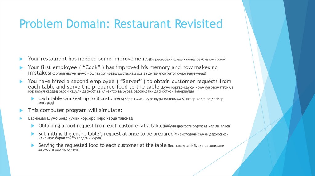 Problem Domain: Restaurant RevisitedYour restaurant has needed some improvements(Ба ресторани шумо якчанд бехбудихо лозим)