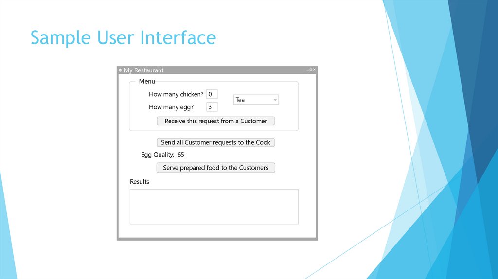 Example: A customer requests 2 chicken, 3 egg and tea(Намунаи нигохдории дархости мизоч