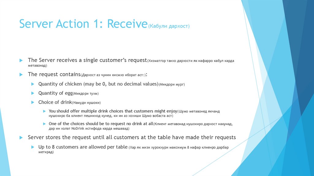 Server Action 1: Receive(Кабули дархост)The Server receives a single customer’s request(Хизматгор танхо дархости як нафарро кабул карда