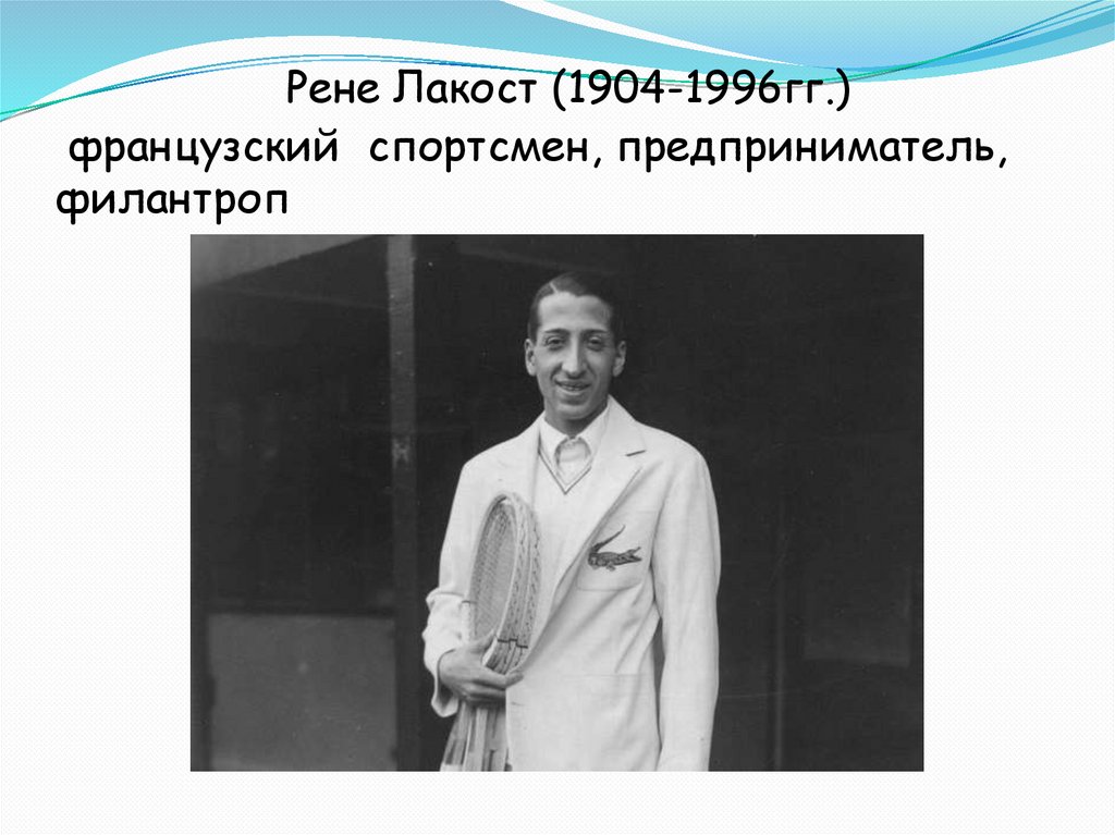 Рене Лакост (1904-1996гг.)французский спортсмен, предприниматель,