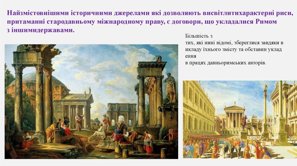 Найзмістовнішими історичними джерелами які дозволяють висвітлитихарактерні риси,притаманні стародавньому міжнародному праву, є договори, що укладалися Римом
