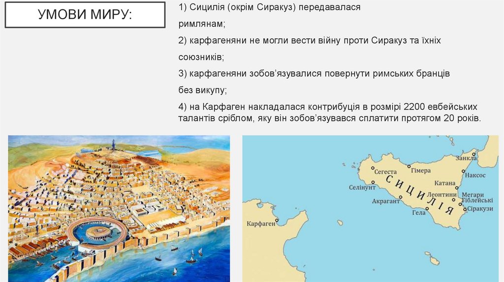 УМОВИ МИРУ:1) Сицилія (окрім Сиракуз) передавалася