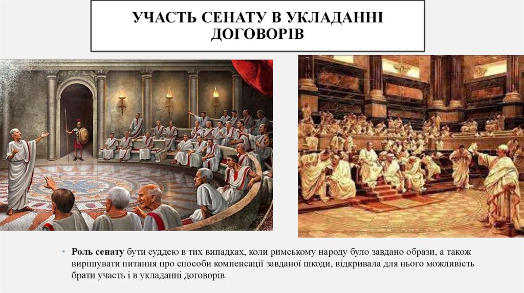 • Роль сенату бути суддею в тих випадках, коли римському народу було завдано образи, а також