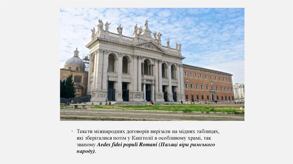 • Тексти міжнародних договорів вирізали на мідних таблицях,які зберігалися потім у Капітолії в особливому храмі, так