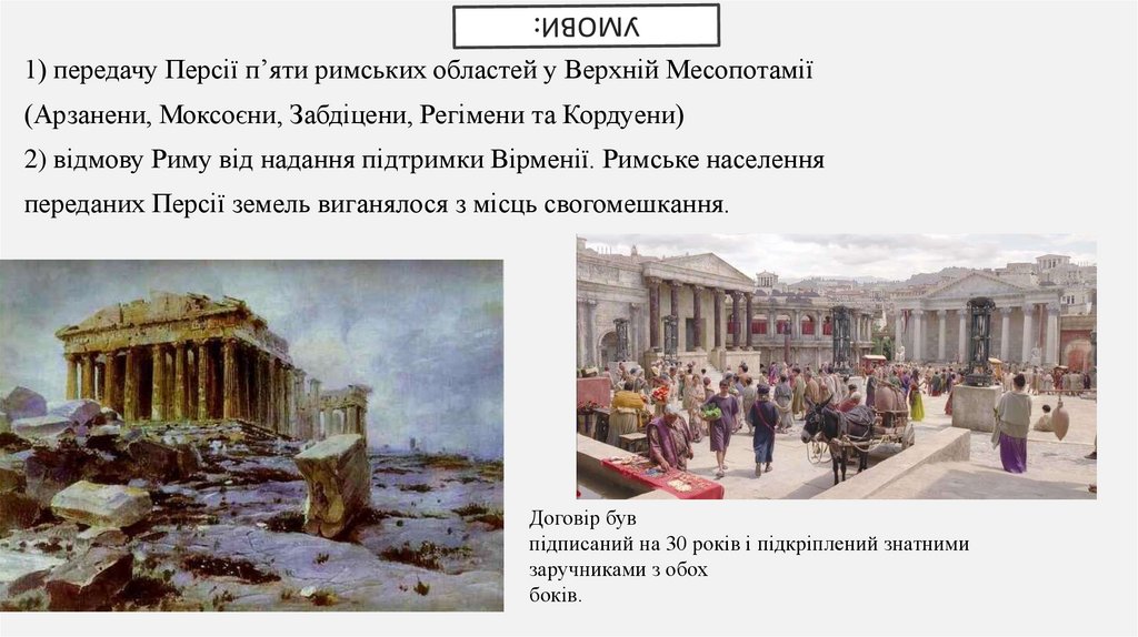 1) передачу Персії п’яти римських областей у Верхній Месопотамії(Арзанени, Моксоєни, Забдіцени, Регімени та Кордуени)