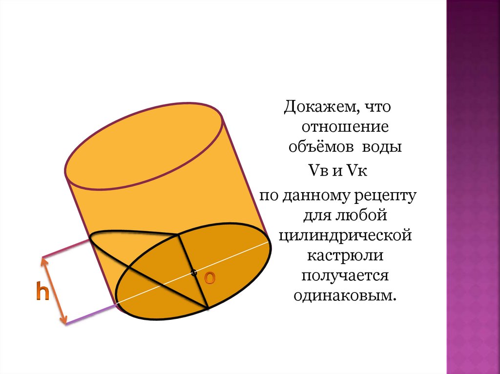 Vтела=2∫S(x)dx=2∫((R²-x²)h/2R)dx=h/R(R²xx³/3)| = h/R(R³-R³/3)=2hR³/3R=2/3hR²