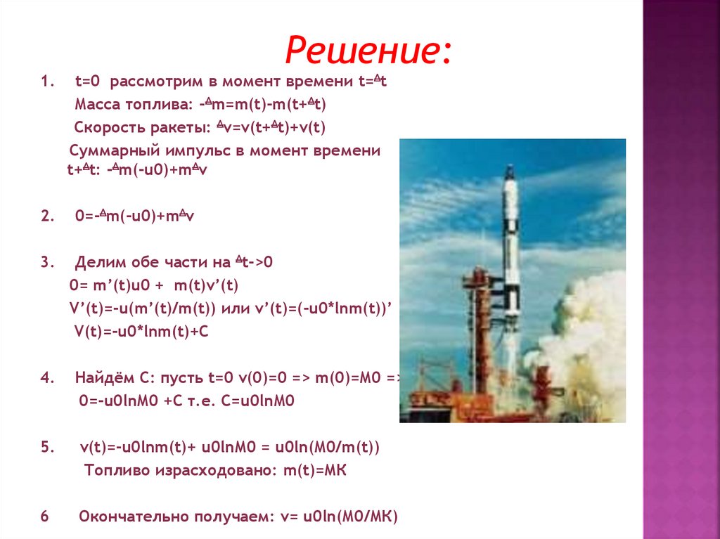 V’(t)=-u(m’(t)/m(t)) или v’(t)=(-u0*lnm(t))’