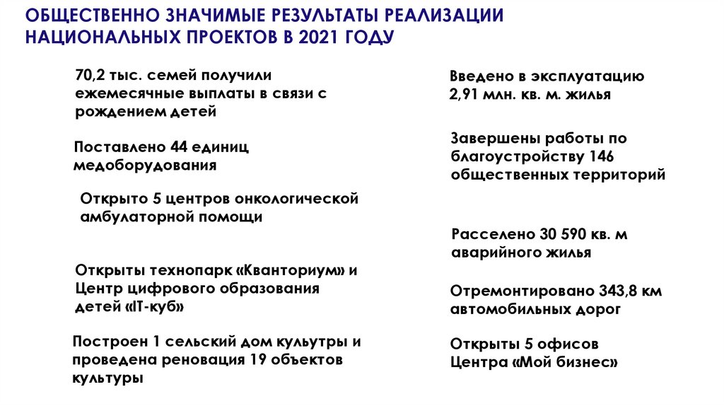 ОБЩЕСТВЕННО ЗНАЧИМЫЕ РЕЗУЛЬТАТЫ РЕАЛИЗАЦИИНАЦИОНАЛЬНЫХ ПРОЕКТОВ В 2021 ГОДУ
