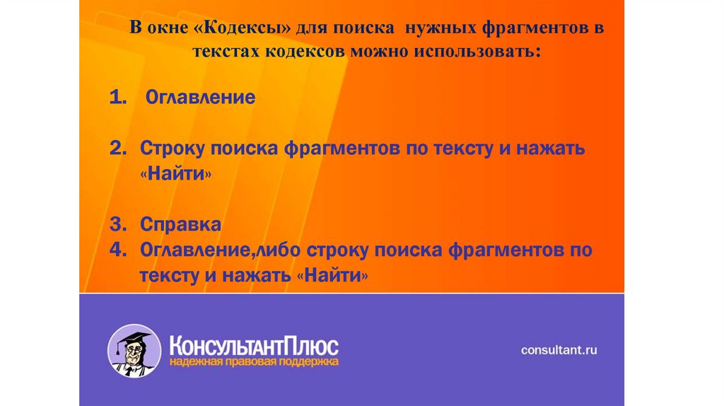 В окне «Кодексы» для поиска нужных фрагментов втекстах кодексов можно использовать: