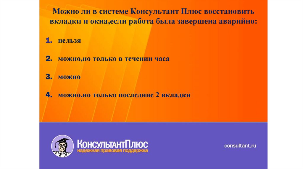 Можно ли в системе Консультант Плюс восстановитьвкладки и окна,если работа была завершена аварийно: