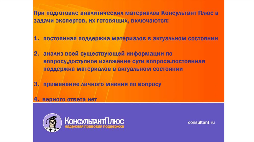 При подготовке аналитических материалов Консультант Плюс взадачи экспертов, их готовящих, включаются: