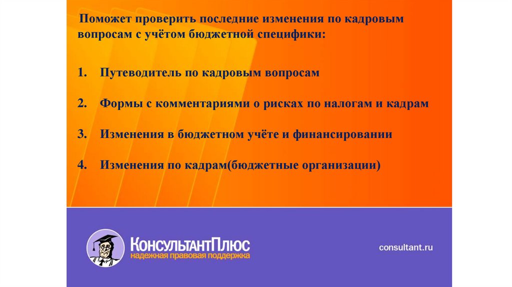 Поможет проверить последние изменения по кадровымвопросам с учётом бюджетной специфики: