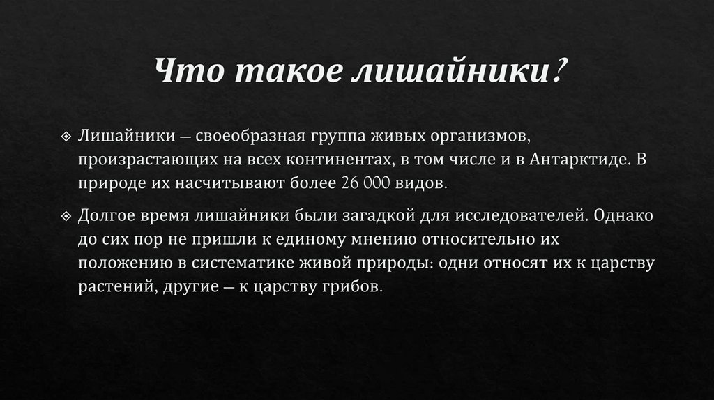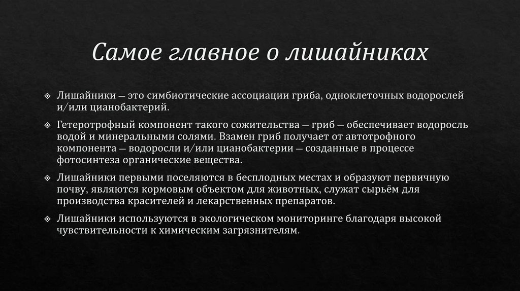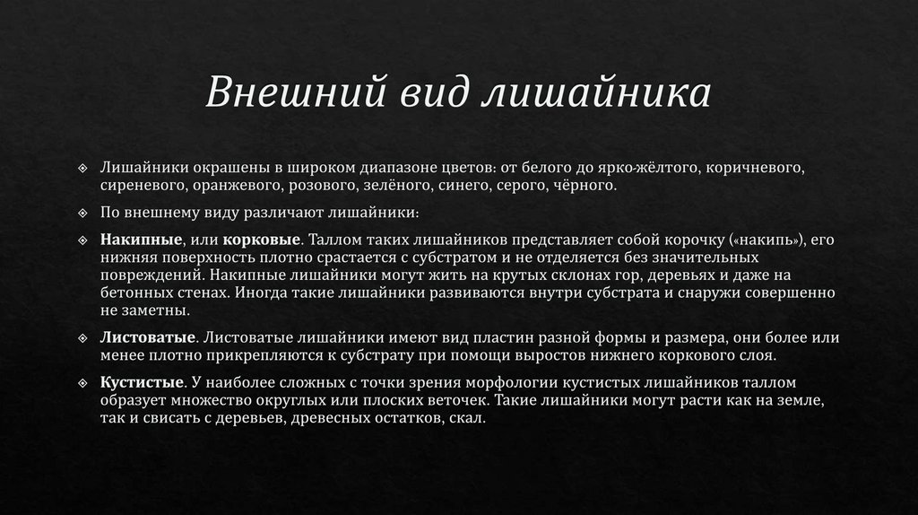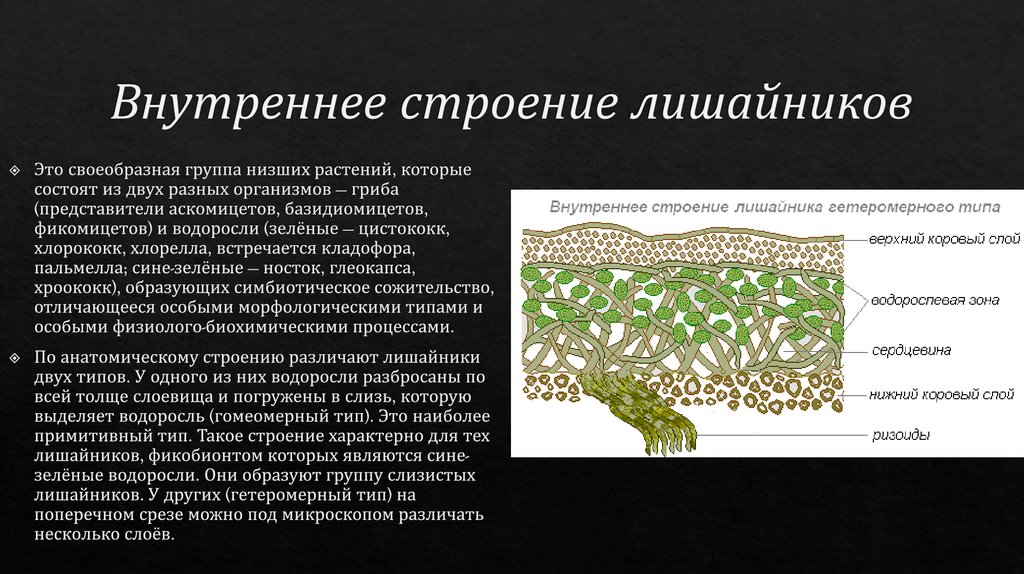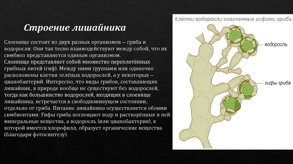 Слоевище состоит из двух разных организмов — гриба иводоросли. Они так тесно взаимодействуют между собой, что их