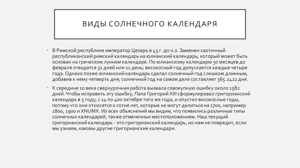 ВИДЫ СОЛНЕЧНОГО КАЛЕНДАРЯ• В Римской республике император Цезарь в 45 г. до н.э. Заменен хаотичный