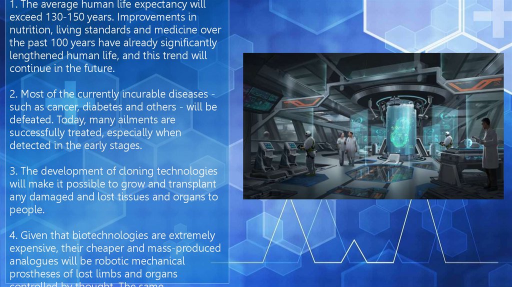 1. The average human life expectancy willexceed 130-150 years. Improvements in