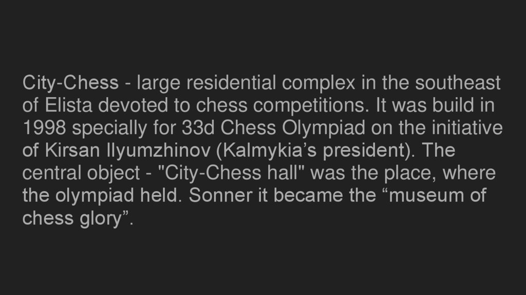 Сity-Сhess - large residential complex in the southeastof Elista devoted to chess competitions. It was build in