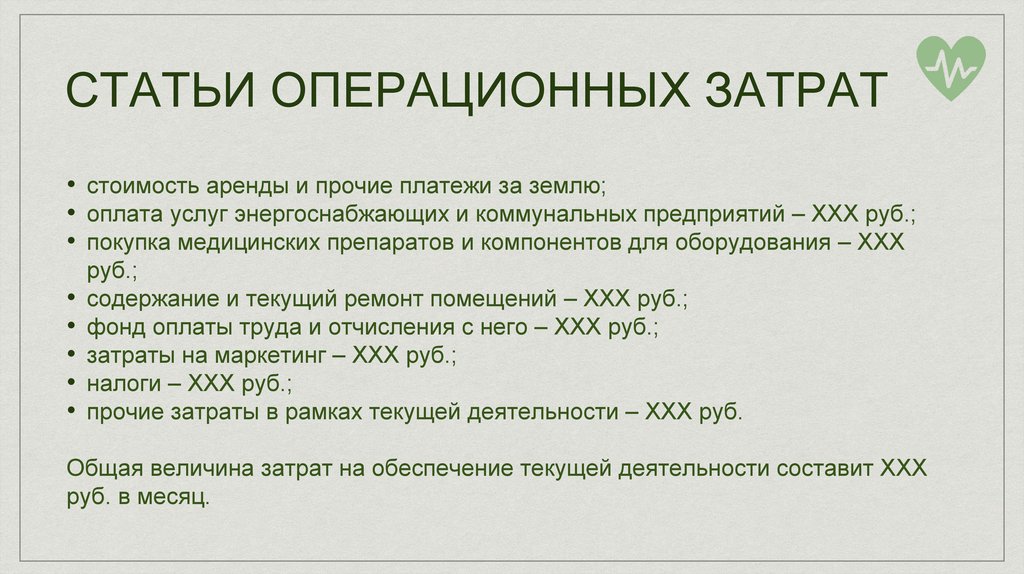 СТАТЬИ ОПЕРАЦИОННЫХ ЗАТРАТ• стоимость аренды и прочие платежи за землю;