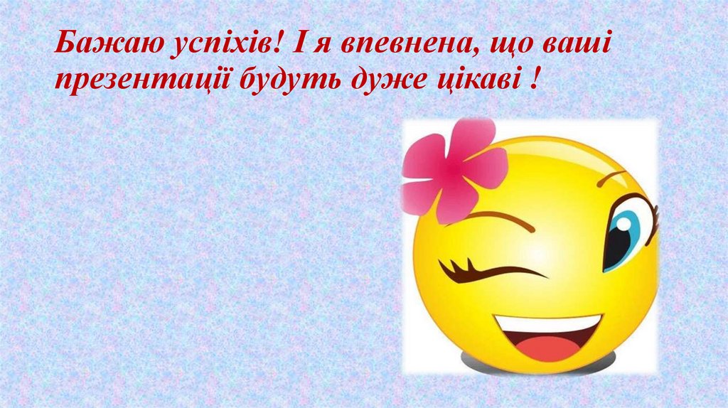Бажаю успіхів! І я впевнена, що вашіпрезентації будуть дуже цікаві !