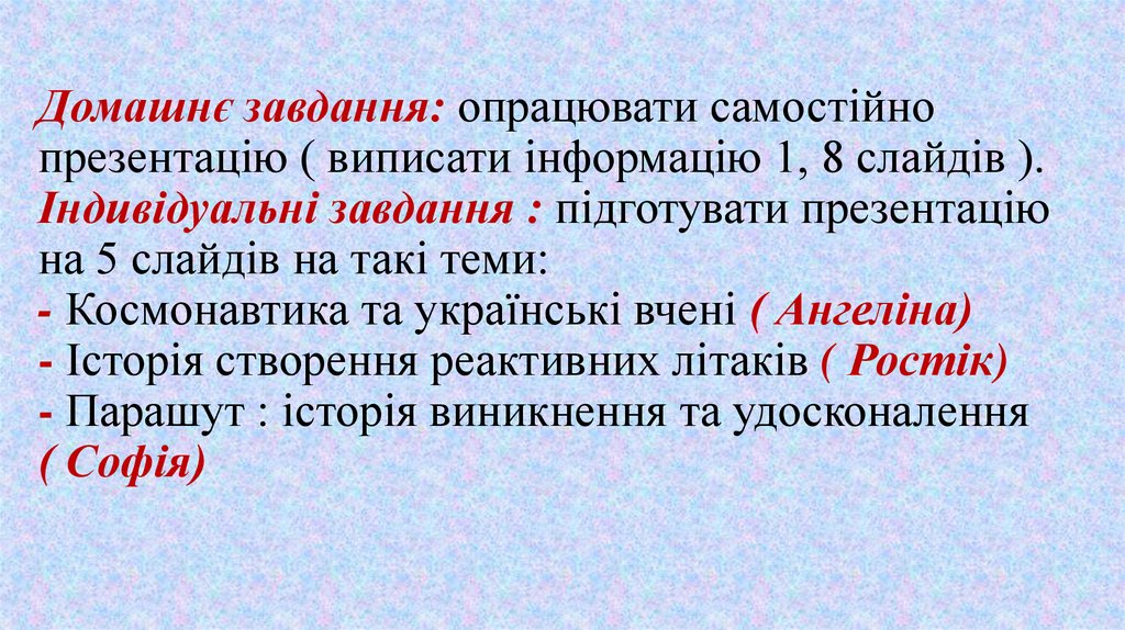 Домашнє завдання: опрацювати самостійнопрезентацію ( виписати інформацію 1, 8 слайдів ).