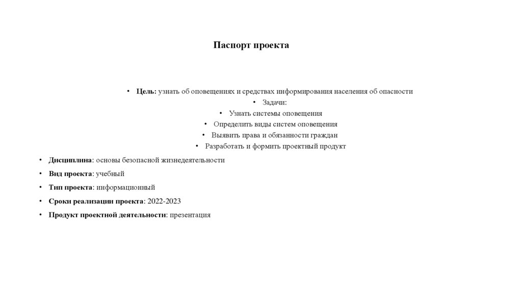 Паспорт проекта• Цель: узнать об оповещениях и средствах информирования населения об опасности