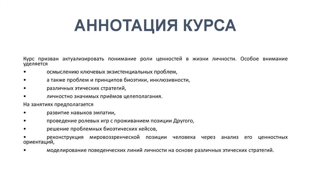 АННОТАЦИЯ КУРСАКурс призван актуализировать понимание роли ценностей в жизни личности. Особое внимание