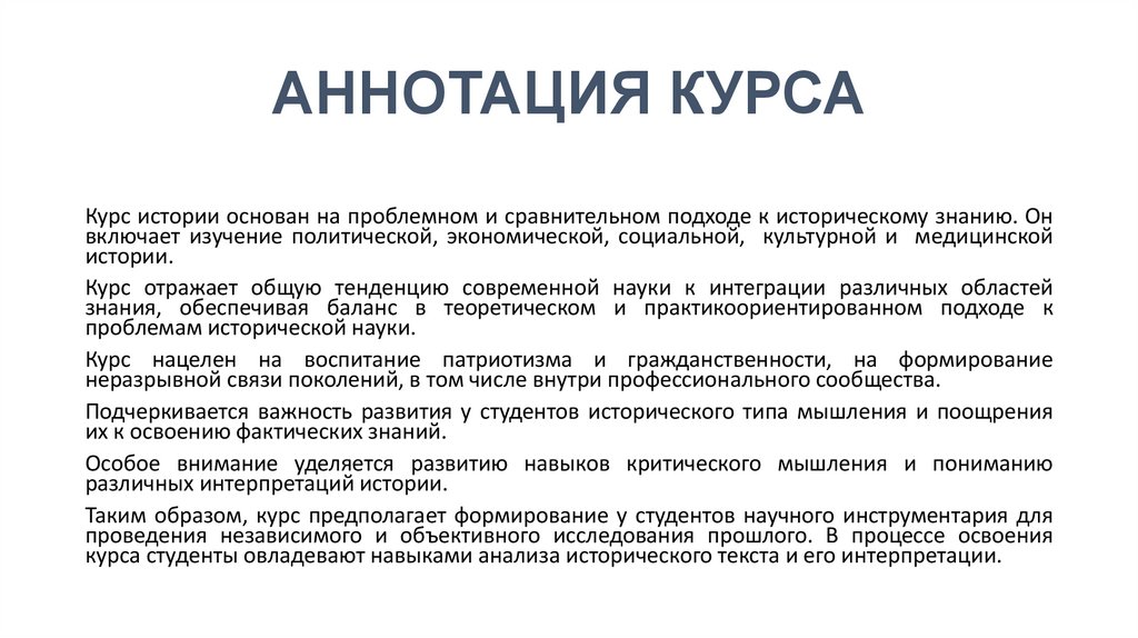 АННОТАЦИЯ КУРСАКурс истории основан на проблемном и сравнительном подходе к историческому знанию. Он