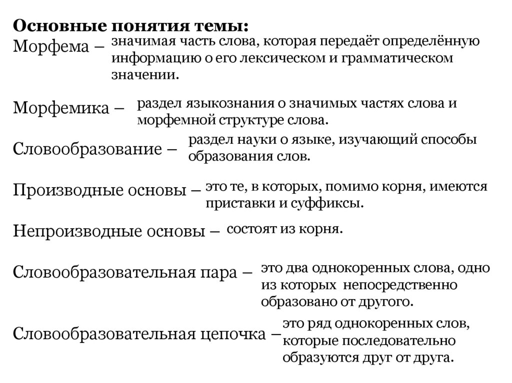 Основные понятия темы:Морфема – значимая часть слова, которая передаёт определённую