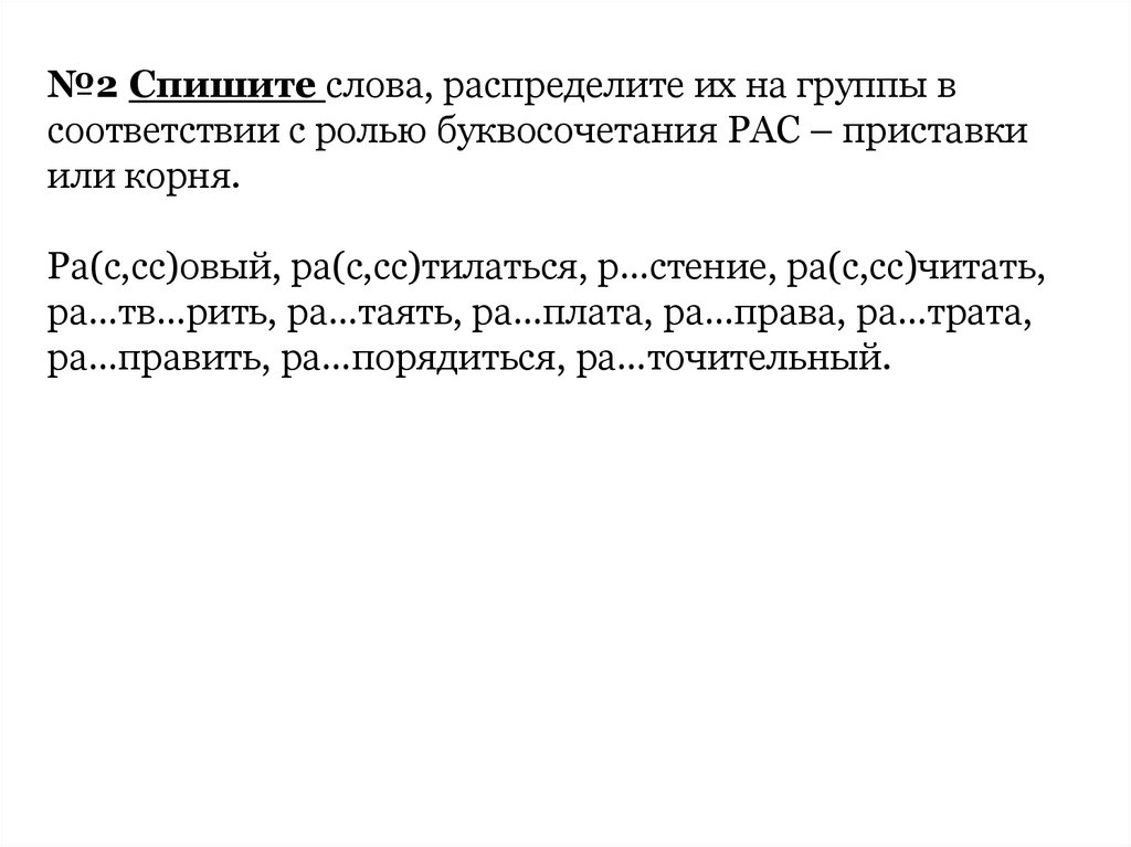 №2 Спишите слова, распределите их на группы всоответствии с ролью буквосочетания РАС – приставки