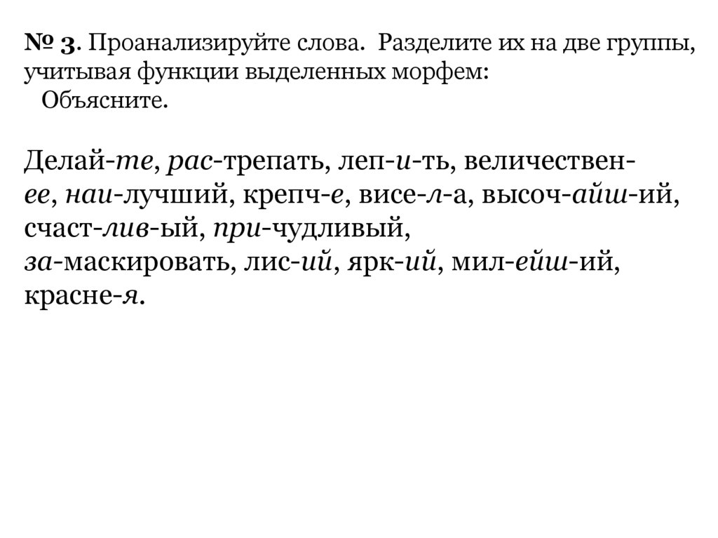 № 3. Проанализируйте слова. Разделите их на две группы,учитывая функции выделенных морфем: