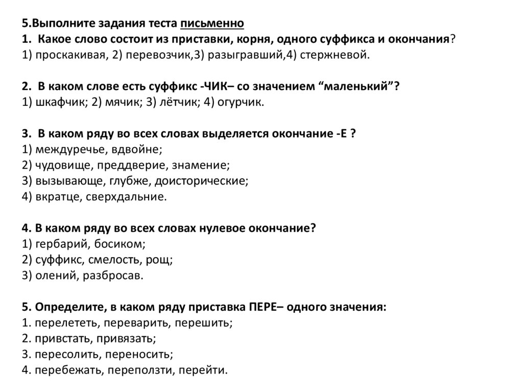 5.Выполните задания теста письменно1. Какое слово состоит из приставки, корня, одного суффикса и окончания?