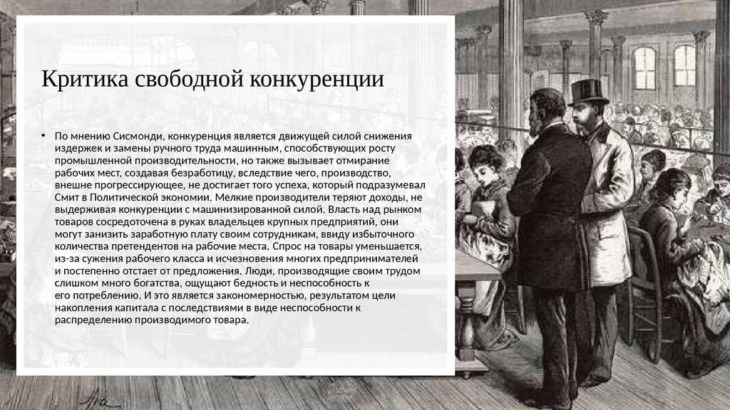 Критика свободной конкуренции• По мнению Сисмонди, конкуренция является движущей силой снижения