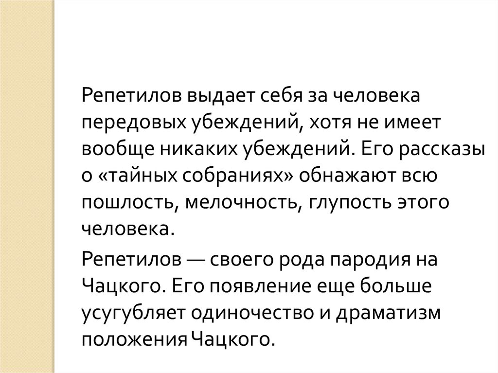 Репетилов выдает себя за человекапередовых убеждений, хотя не имеет