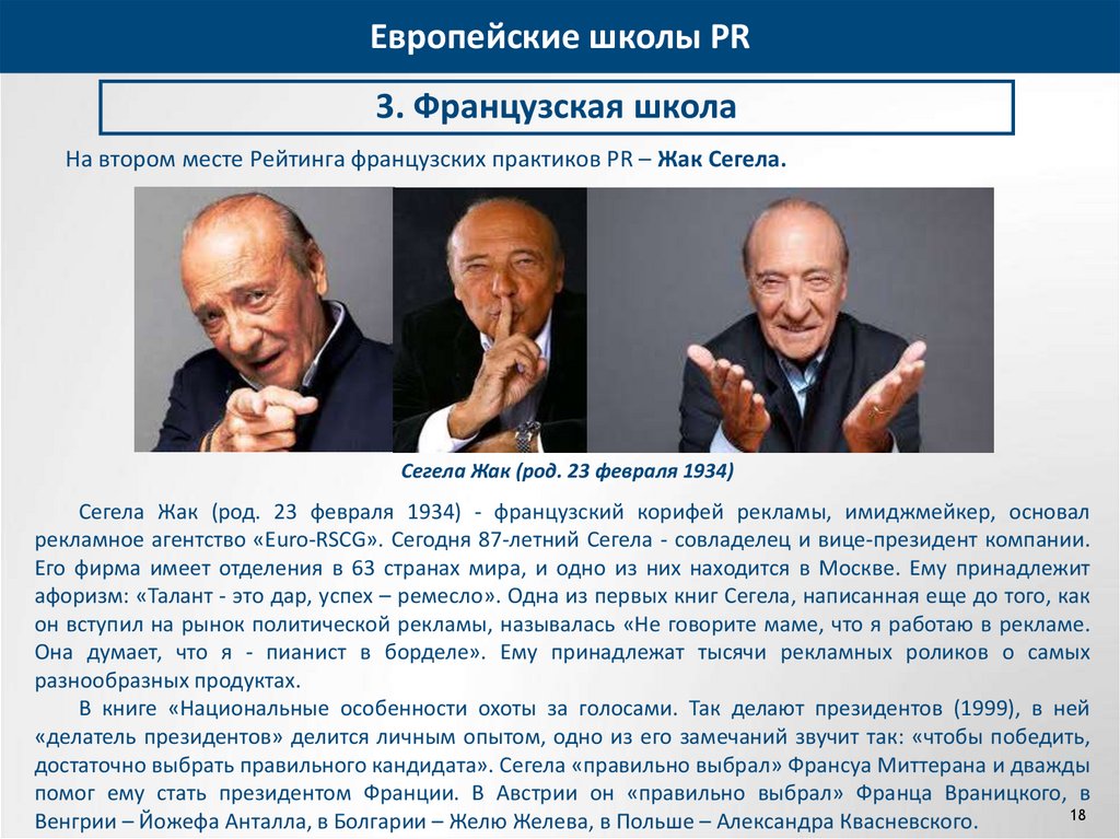На втором месте Рейтинга французских практиков PR – Жак Сегела.