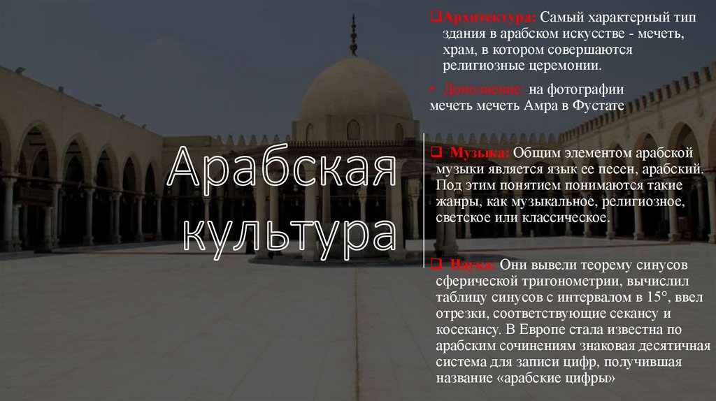 Архитектура: Самый характерный типздания в арабском искусстве - мечеть,