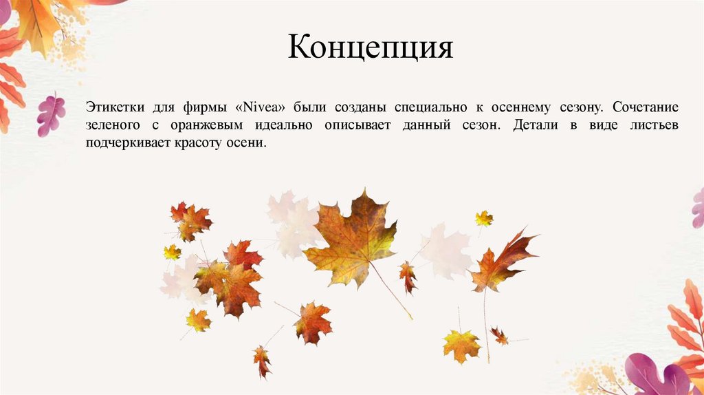КонцепцияЭтикетки для фирмы «Nivea» были созданы специально к осеннему сезону. Сочетание