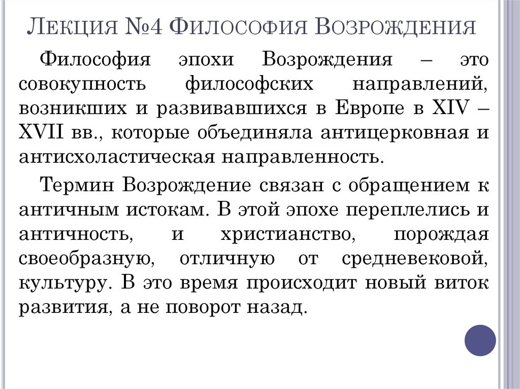 ЛЕКЦИЯ №4 ФИЛОСОФИЯ ВОЗРОЖДЕНИЯФилософия эпохи Возрождения – это