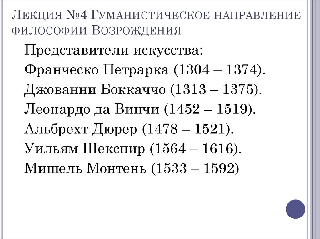 ЛЕКЦИЯ №4 ГУМАНИСТИЧЕСКОЕ НАПРАВЛЕНИЕФИЛОСОФИИ ВОЗРОЖДЕНИЯ