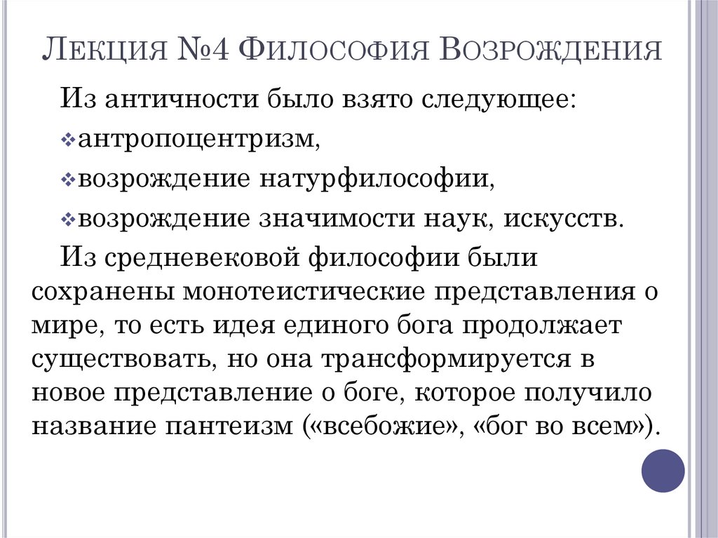 ЛЕКЦИЯ №4 ФИЛОСОФИЯ ВОЗРОЖДЕНИЯИз античности было взято следующее:
