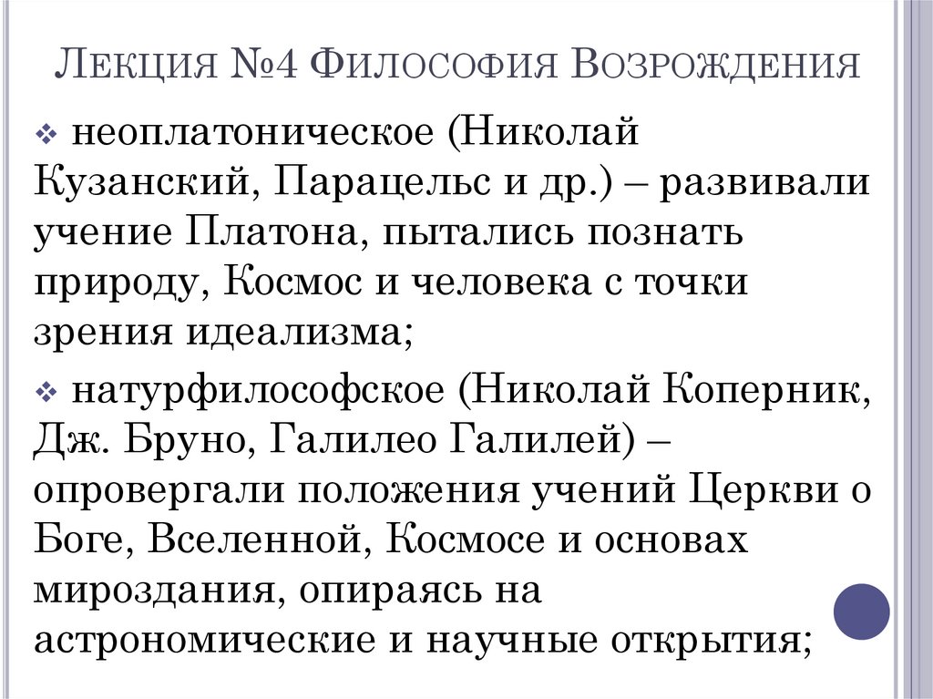 ЛЕКЦИЯ №4 ФИЛОСОФИЯ ВОЗРОЖДЕНИЯнеоплатоническое (Николай