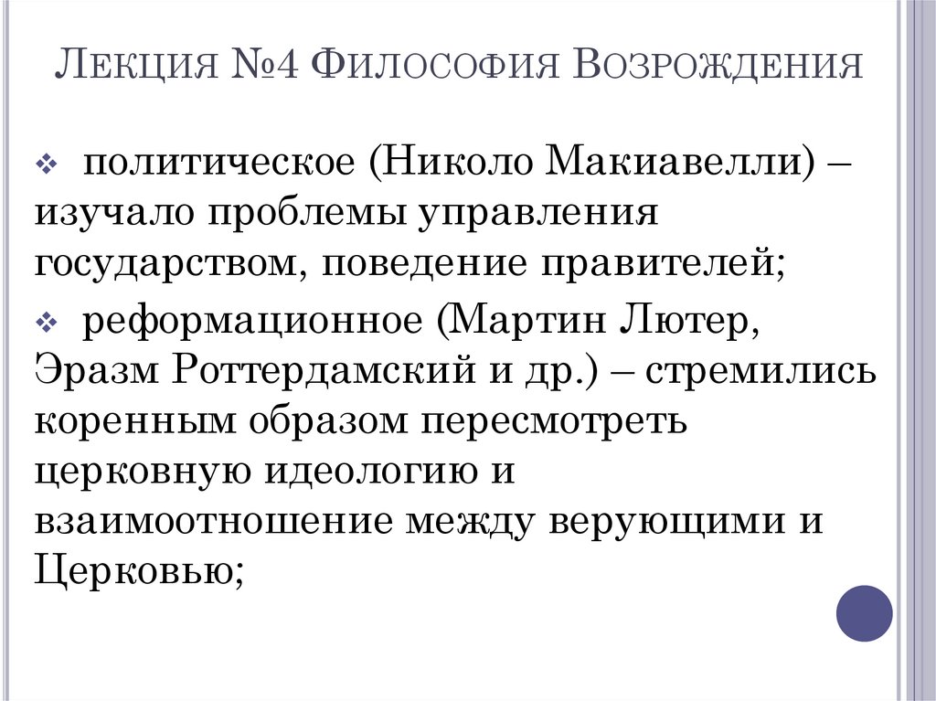 ЛЕКЦИЯ №4 ФИЛОСОФИЯ ВОЗРОЖДЕНИЯполитическое (Николо Макиавелли) –
